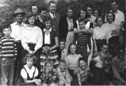 Peppers Family circa 1952 Robert W. Smith, H. Pierce Sledge, Sandra J. Sledge, Minnie Lee Peppers Fite, Eunice A. Peppers Sledge, E. Delores Sledge, Benjamin L. Smith, Anna Frances Peppers, Ronnie L. Smith, Corinna Crumley, Jesse R. Crumley, M. Lucile Peppers McCarley, L. Frances Evans, Louise Hurst, John William Hurst, Carol A. Sledge, M. Colin Sledge, Lanny M. Sledge, Laura V. Peppers Smith, Jonnie L. Hurst, J. W. Hurst, Jr., Philip Evans, J. Alvin Evans, Bobby R. Ivey(?) |
